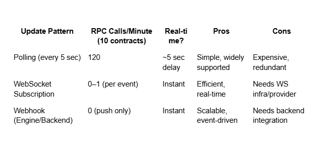 - WebSockets: Use event subscriptions that push updates only when something changes. Some providers and SDKs (ethers.js with WebSocket, custom relays) support this and can broadcast updates app-wide.