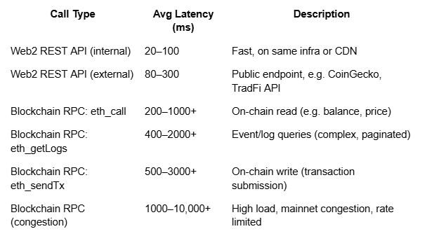 - Web2 APIs are typically 3–20x faster than blockchain RPC endpoints. Under stress, blockchain queries can be 100x+ slower.